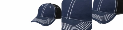 100% cotton twill with contrasting back panels Heavy enzyme wash Unstructured, six-panel, low-profile Pre-curved visor with heavy distressing Eyelets match heavy contrast stitching Heavy raised white contrast color stitching Self-fabric top button matches back panel color Self-fabric closure with silver sliding buckle and tuck in tunnel